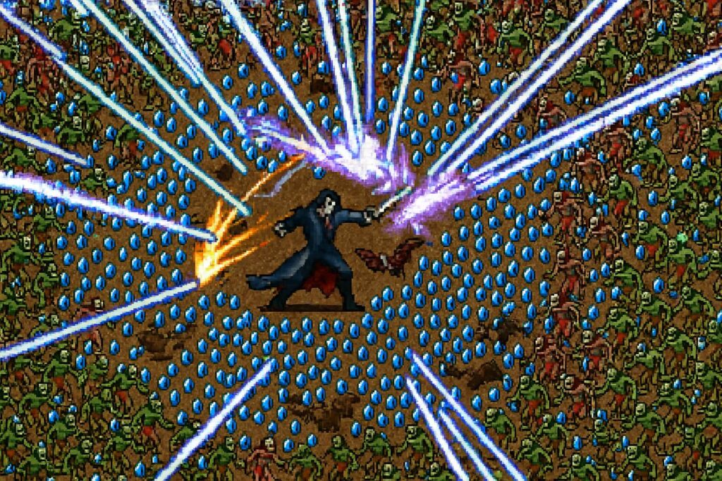 Lu cuma fokus: jangan mati. Monster datang dari segala arah dengan pola semi-random. Tiap level up, pilih 3-4 opsi upgrade: senjata baru, passive buff, atau evolusi item. Dan ini yang bikin otak lu tetep kerja meski cuma “mencet joystick”.